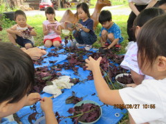 みんな一生懸命作業しました。手のひらが、赤じそで赤〜く染まりました。あとはお日様に干して出来上がり。お日様、お願いしま〜す!